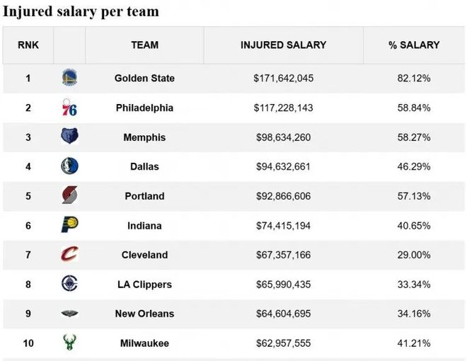 勇士今天缺战的球员有巴特勒(背伤)、追梦(生病)、库里(脚踝)、库明加(膝盖)、霍福德(背靠背轮休),薪资高达1.716亿美元,占球队总薪资的82.12%