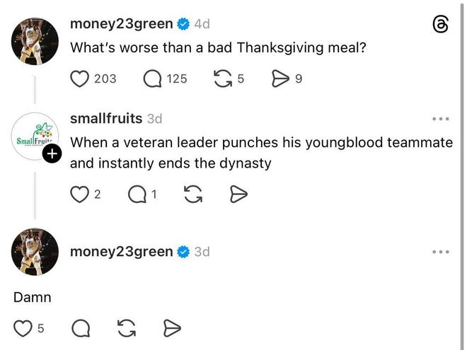 一名网友回复道:“一名老将领袖球员给了队中的青年才俊一拳并毁掉了这支球队的王朝。”