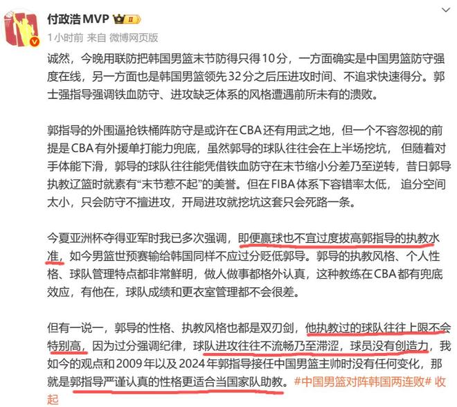 亚洲杯上,赵睿、胡金秋、王俊杰的精气神完全断档其他人,而重返国家队的周琦、张镇麟不是能力不行,但确实不太适合国家队气质。但现实情况就是,在世界大赛脚步已经越来越近的情况下,中国队可能也不敢冒太大风险,去临阵换帅了。媒体人付政浩直言:郭士强执教过的球队往往上限不会特别高。那么,这支中国男篮还能打进2027年的世界杯吗?