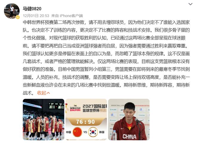 前男篮国手马健在赛后公开发声,将矛头直指主教练郭士强的选人与建队思路,甚至直言:“请不用去埋怨球员,因为他们决定不了谁能入选国家队”、“我们篮球认知更多是停留在表面上的自以为是,而忽略了篮球本身的规律”
