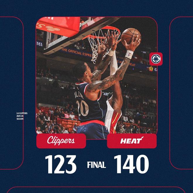 小卡上篮得分,鲍威尔高位跳投得手,祖巴茨暴扣还以颜色。小卡抢断后上篮得分,热火再次请求暂停。小卡2罚全中,分差仅为13分,快船看到了逆转取胜的希望。威金斯与祖巴茨在禁区对轰,米切尔高难度单打命中,小卡回敬2+1。希罗低位打进2+1,鲍威尔、威金斯相继轰进远投,热火重新取得21分领先锁定大局。距离终场不足1分钟之际,两队派上板凳席末端的球员,比赛彻底失去了悬念。桑德斯2罚全中,布朗暴扣,时间走完。最终,热火以140比123完胜快船,本赛季双杀对手。此战之后,吞下了5连败的快船,排名跌至西部倒数第2。