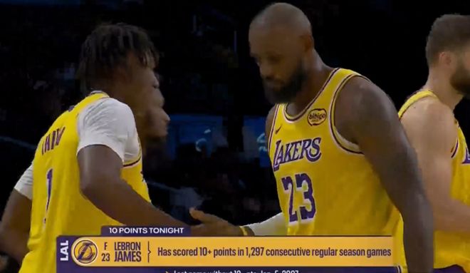 詹姆斯在对阵太阳的比赛当中,最后时刻为了自己连续1297场得分上双纪录的延续公然刷分,装都不装了。就在他刷分成功之后只过去了1分07秒,湖人队撤下全主力直接投降,就是为了让主力陪着詹皇刷分,才把他们留在场上的。