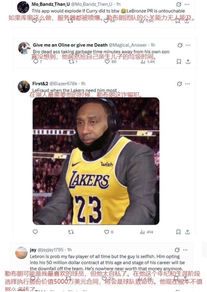 最后还有一个詹姆斯球迷,他直接倒戈了,他就发表评论表示:“勒布朗是我最喜欢的运动员,但是他真的太自私了,他已经是这个年纪,生涯到了这个阶段了,先执行了自己5000万的合同,成为了球队的致命短板,现在又证明自己根本不值这么多钱。”这是詹皇自己的球迷,还有美国网友说:“他拿了10分,刷了纪录,立刻下场让儿子替他上,他这样甚至都赢得不了狄龙布鲁克斯的尊重。”、“就这还要碰瓷乔丹?真正的GOAT永远不会在垃圾时间这么干。”
