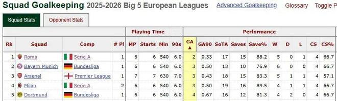 不过,若从数据层面分析,五大联赛最稳的防线并不属于阿森纳,而是属于意甲大黑马,排名第2的罗马队。加斯佩里尼执掌的罗马6轮比赛仅丢2球,防守效率冠绝欧洲;紧随其后的则是拜仁慕尼黑、阿森纳和AC米兰,各失3球。上赛季,罗马队一度濒临降级,老帅拉涅利紧急复出“补锅”,最终将罗马带到了第5的位置。现如今,罗马在冠军教头加斯佩里尼麾下越战越勇,已经高居意甲第2位。
