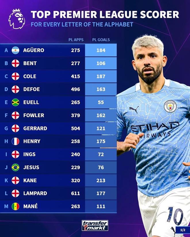 德转按姓氏首字母列英超历史最佳射手:亨利、凯恩、鲁尼在列