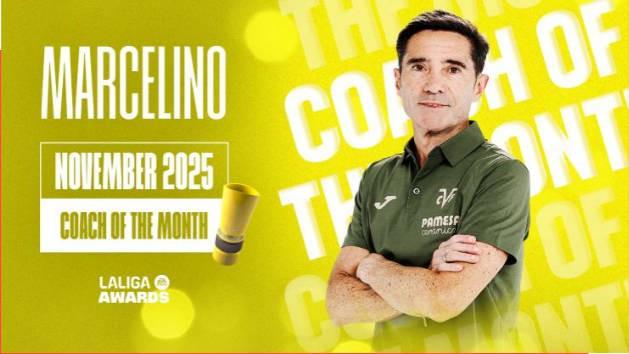 马塞利诺被评选为西甲11月最佳教练,比利亚雷亚尔在这个月表现出色,赢得了所有比赛,取得了全部分数,并因此升至积分榜第三位。